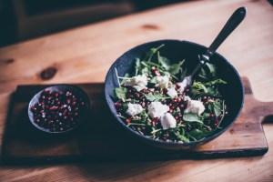 Do mísy si dáme rukolu, posypeme ji vyloupanými zrníčky granátového jablka a poklademe kousky sýra. Nakonec vše zasypeme semínky a zalejeme zálivkou. A máme hotovo, dobrou chuť!
