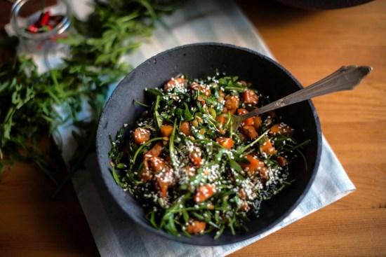 Salát s chřestem, černou čočkou a lososem